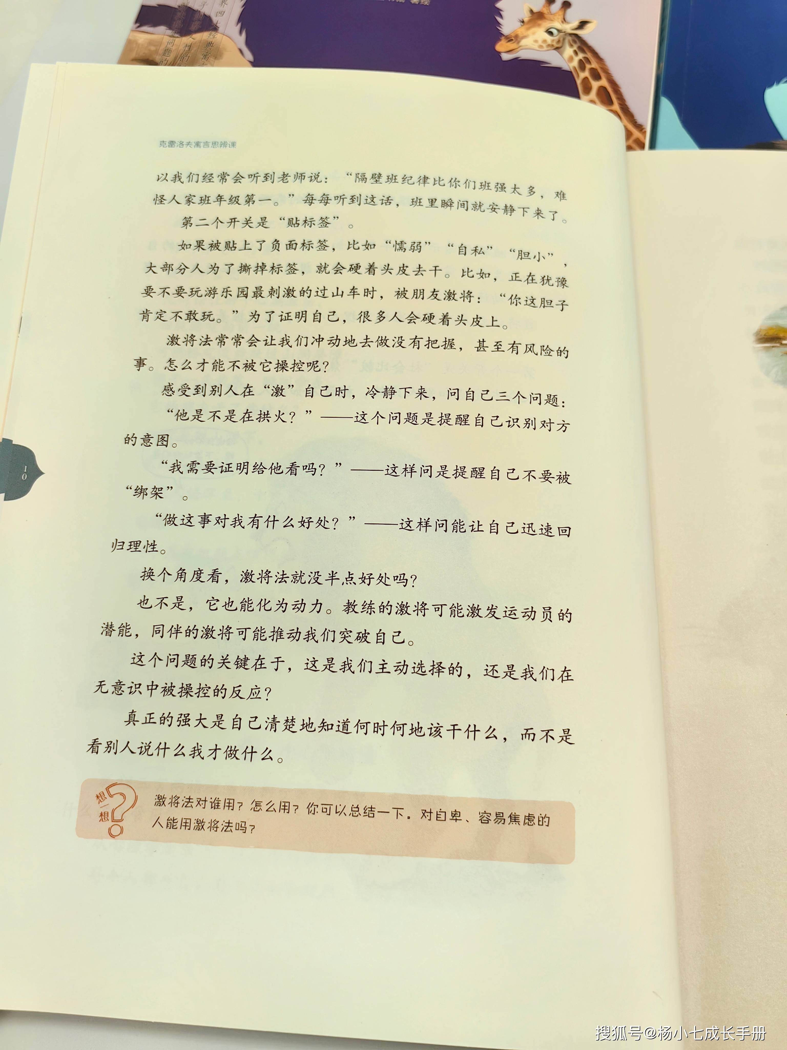 再通过“思辨小课堂”解读狐狸的“酸葡萄心理”,这可以认为是一种心理防卫机制,在现实中,酸葡萄心理也不全是坏处,有时候这种自我安慰机制如同心理止痛剂,能有效缓解焦虑,避免陷入自我否定的漩涡。