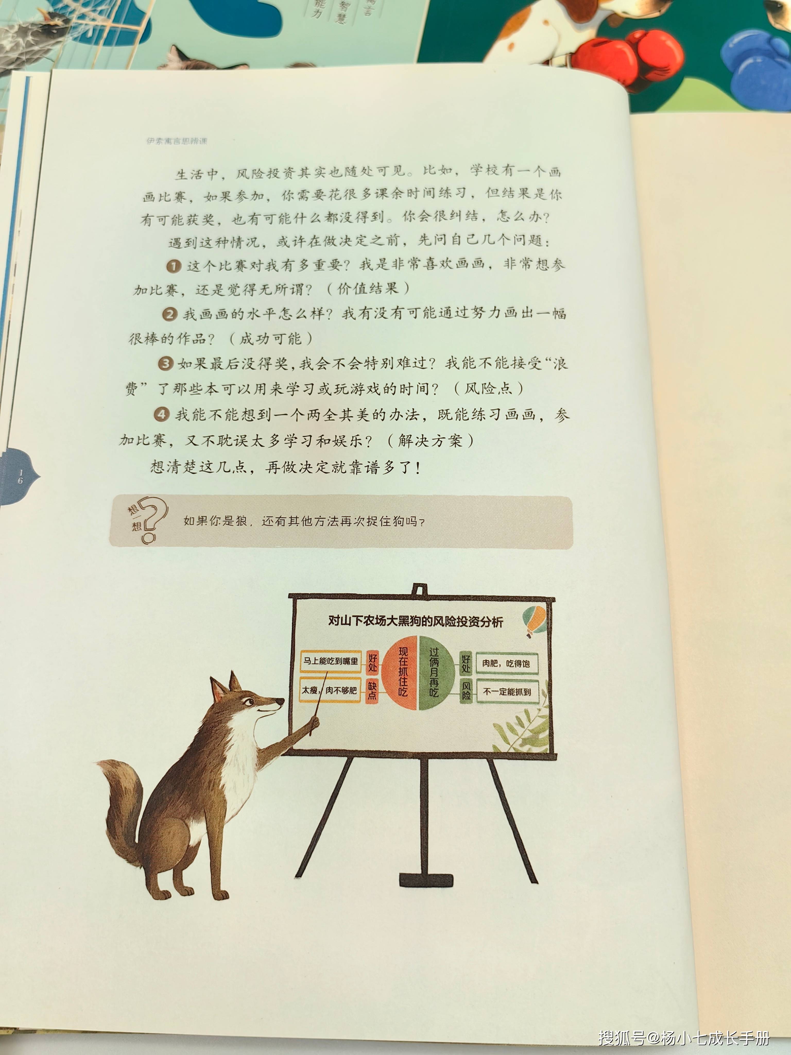 《狼和狗》讲到了经济领域的风险投资,其实孩子的生活中风投随处可见。比如,想参加画画比赛但又怕耽误学习,该怎么办?可以先问自己4个问题,分别代表了价值结果、成功可能、风险点、解决方案,这样的思维方式对孩子解决生活中的很多实际问题都大有帮助。