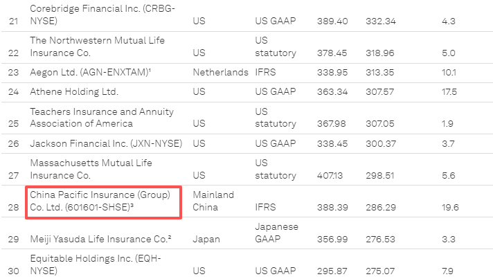 11月7日金融一线消息,近期标准普尔全球市场情报(S&P Global Market Intelligence)根据2024年寿险和健康险准备金以及独立账户/保险和投资合同准备金或负债,发布了全球寿险公司50强。