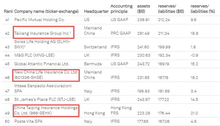 本次共有6家中国保险公司上榜。值得注意的是,:中国人寿(43.750, -0.11, -0.25%)超越安联保险集团,成为全球最大的寿险公司。此外,:中国平安(58.910, 0.01, 0.02%)位列第3名,:中国太保(35.630, 0.14, 0.39%)、泰康保险、:新华保险(67.340, -0.41, -0.61%)、中国太平4家保险公司分别位列第28名、第42名、第46名、第49名。