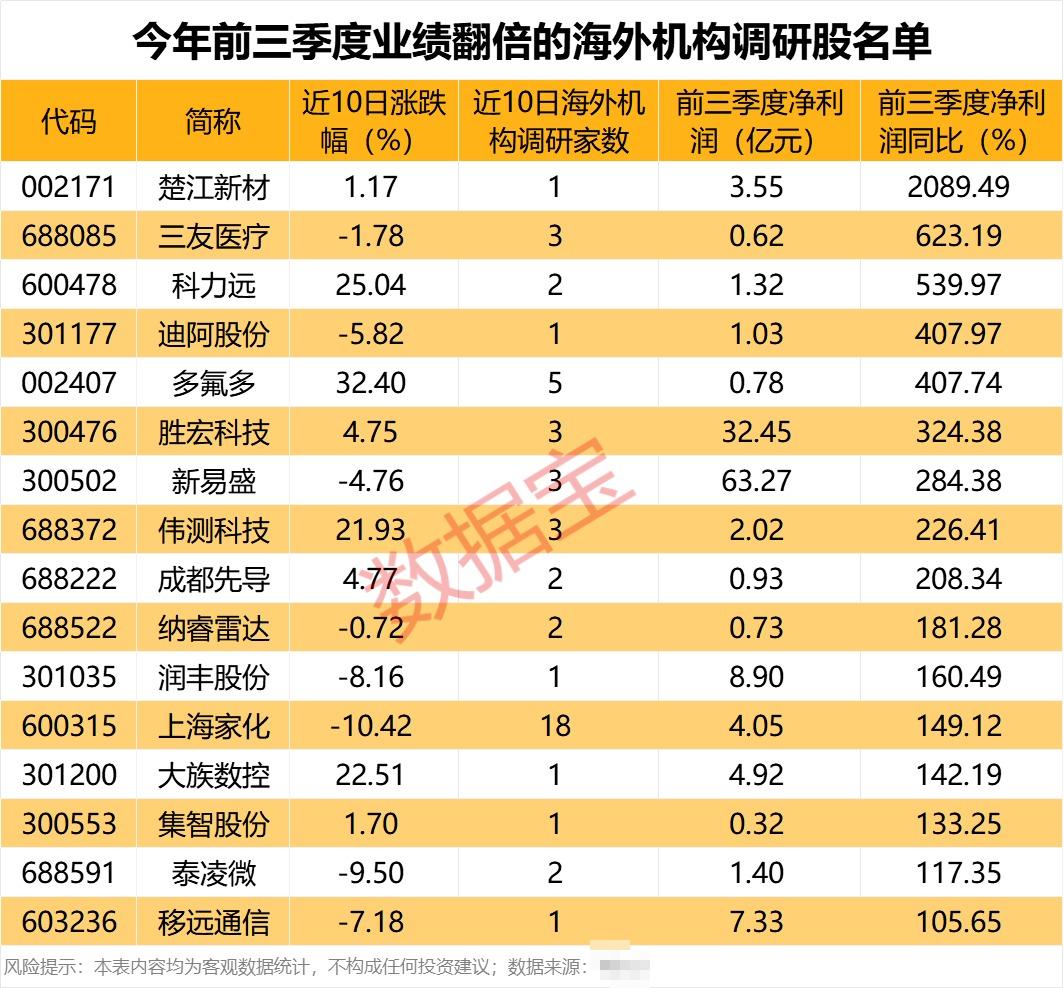 16只海外机构调研股业绩翻倍