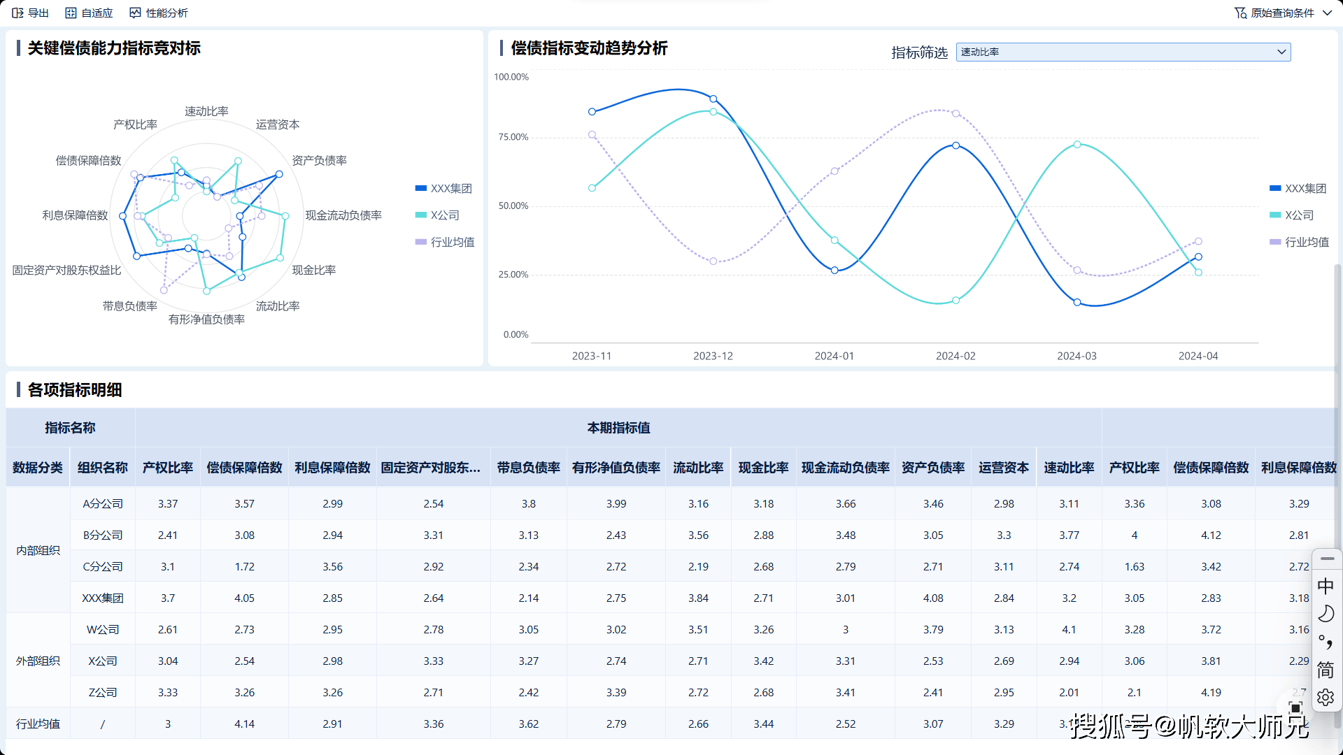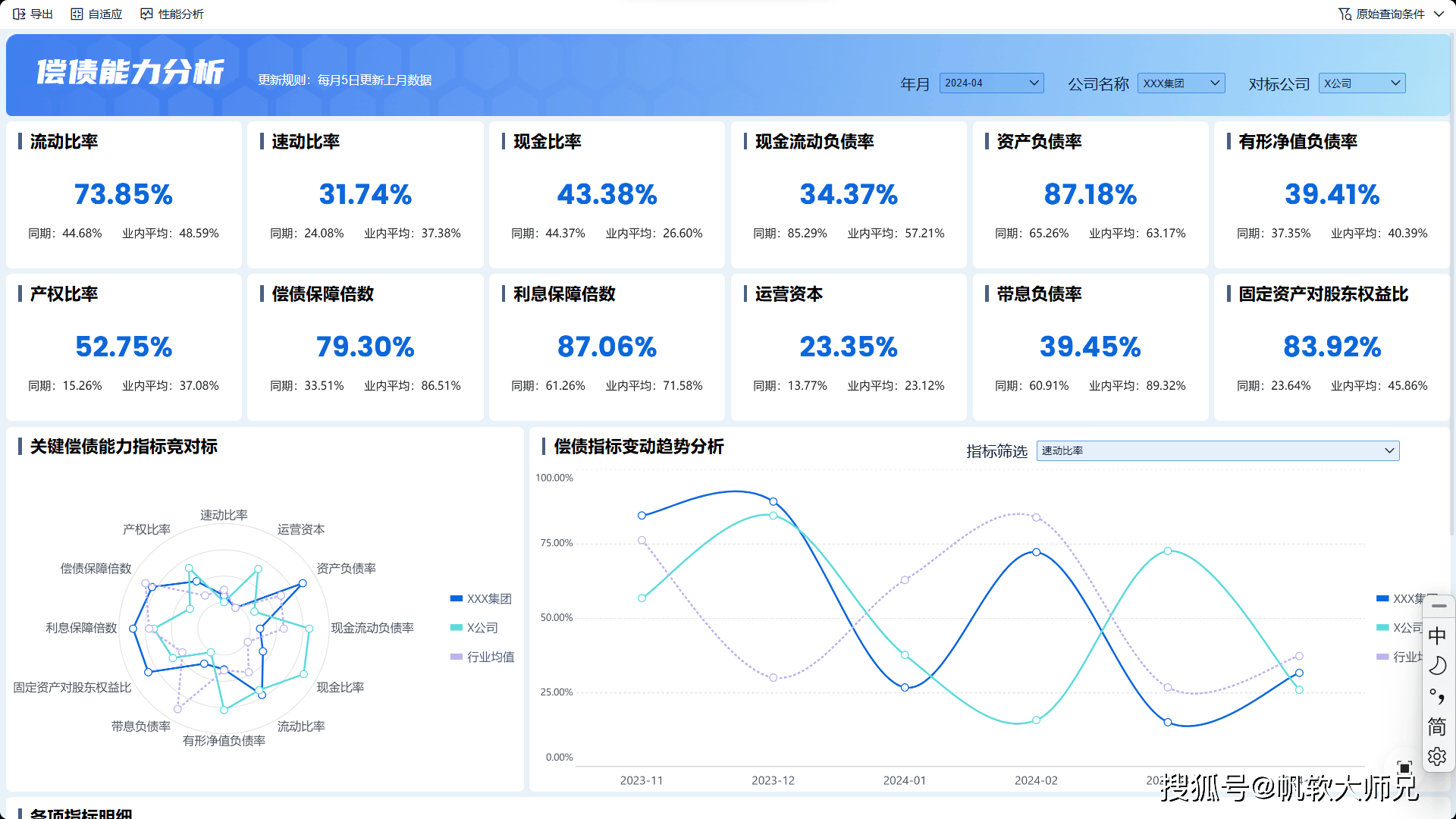 我建议大家利用**数据分析工具**来搭建一个可视化看板图,比如我这里用的是**FineBI**搭建的**偿债能力分析**看板图,这些数据是不是很直观?你把上面的模块一一拆解就很清楚了。我把这份偿债能力分析模板放在这里,改改参数就能套用,需要自取:https://s.fanruan.com/f8rnq(复制到浏览器打开)