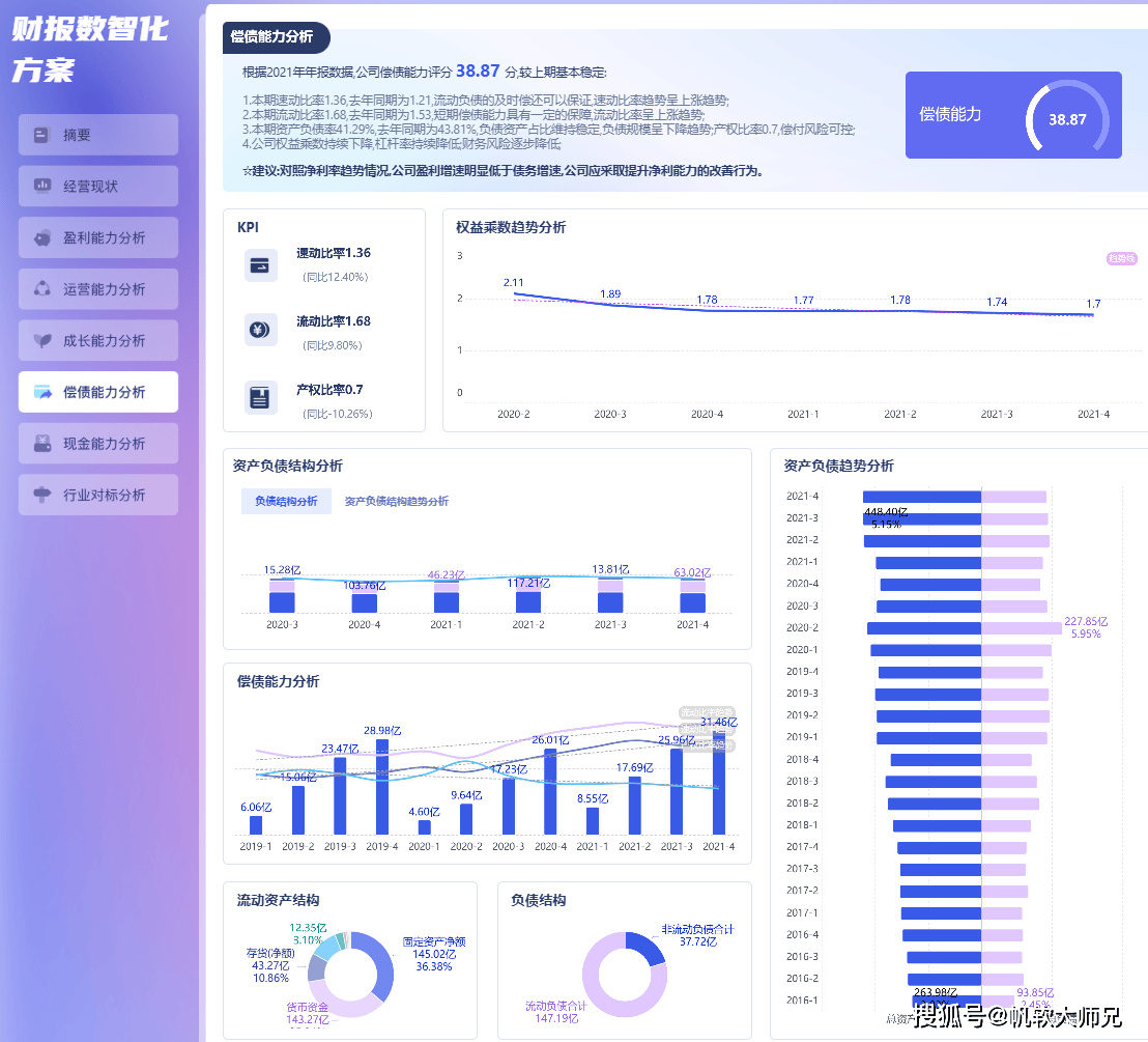 前面说过,光知道偿债能力是不够的,分析财报还得考虑多个指标,这里给大家分享一份《**企业财务五力分析解决方案**》,它**提供了盈利分析、成本控制等方面,还能帮你搭建一个有效的分析路径,帮你提升企业的财务数字化分析能力,判断公司财务的健康水平**。需要自取:https://s.fanruan.com/f8rnq(复制到浏览器打开)