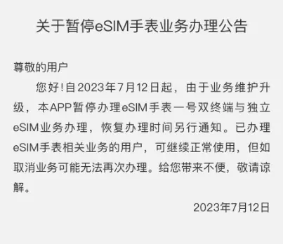 自 2023 年 7 月 12 日起,由于业务维护升级,本 App 暂停办理 eSIM 手表一号双终端与独立 eSIM 业务办理,恢复办理时间另行通知。已办理 eSIM 手表相关业务的用户,可继续正常使用,但如取消业务可能无法再次办理。