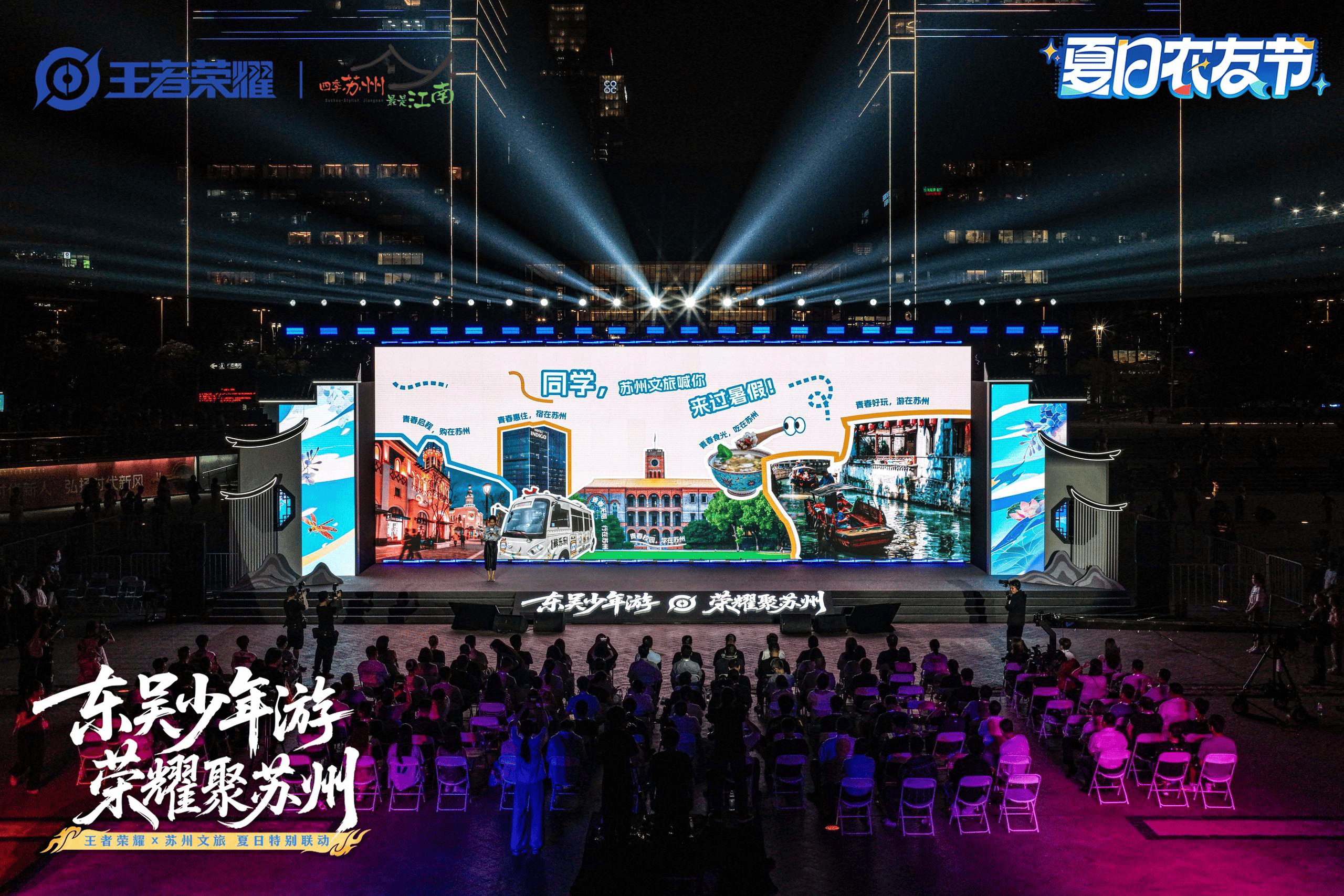 7月15日晚,一场「游戏X文旅」的跨界合作发布活动在苏州金鸡湖畔启幕,苏州文旅与国民游戏《王者荣耀》宣布以“东吴少年游,荣耀聚苏州”为主题,共同策划“夏日农友会”,通过将游戏形象与城市深度融合,为游客打造一个全场景覆盖、沉浸式的全新组合玩法,让更多年轻人从线上走到线下,感受传统文化的魅力。