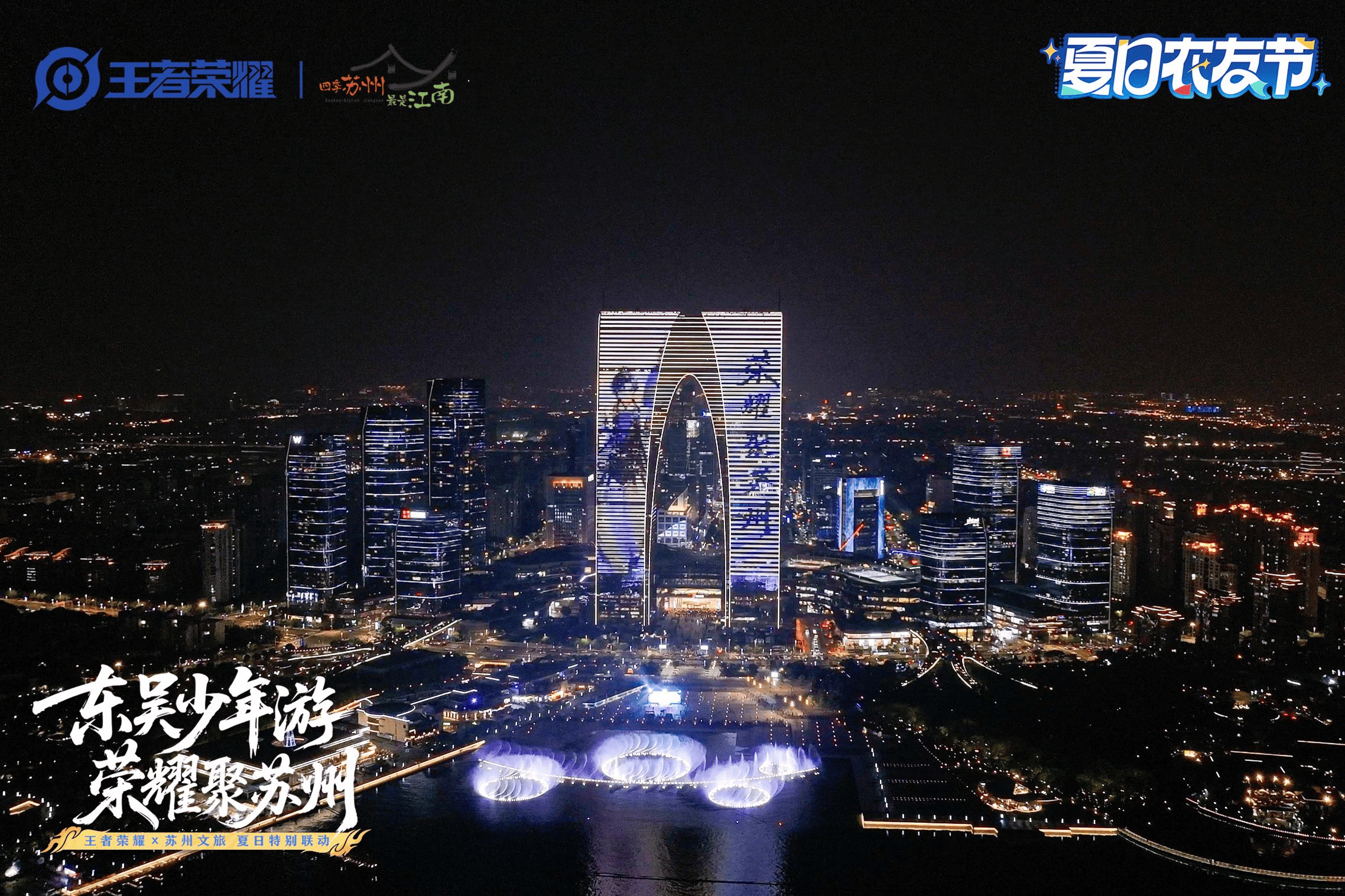 当夜幕降临,苏州新地标——东方之门倏然点亮,王者暑期新上线的东吴阵营英雄孙权的形象投射与金鸡湖音乐喷泉“湖水涟漪”交相辉映,一场穿越虚拟与现实的对话瞬间点燃了现场观众的热情,也正式宣告了苏州×王者这段「夏日奇遇」之旅的开启。