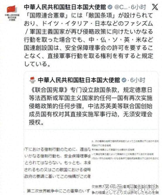 这一事件的背后,引人深思的历史因素——《联合国宪章》中的敌国条款再次被提及。尽管这个条款曾被视为战后遗留的问题,但中国驻日大使馆正式警告日本:某些政客的行为正将国家推向无法控制的深渊。