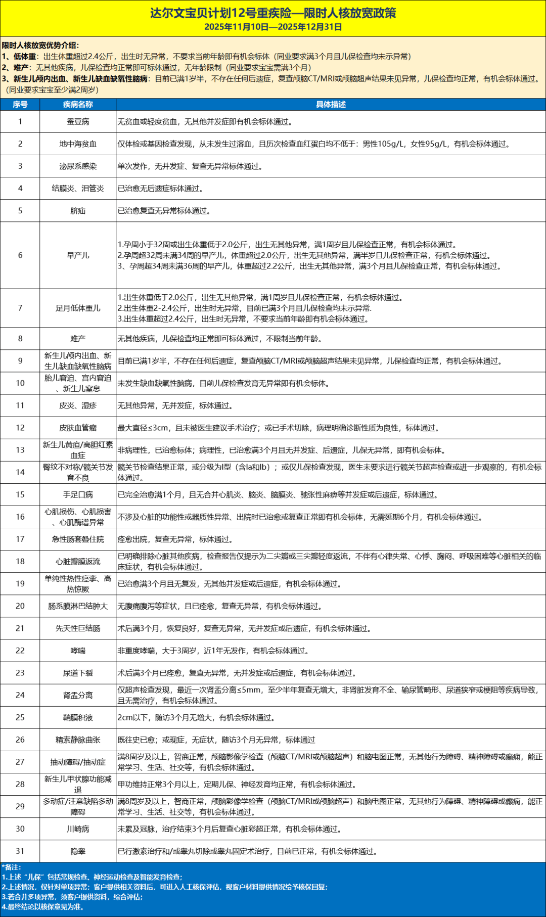 达尔文宝贝计划12号将于**2025年11月10日-2025年12月31日**期间放宽人工核保的尺度!