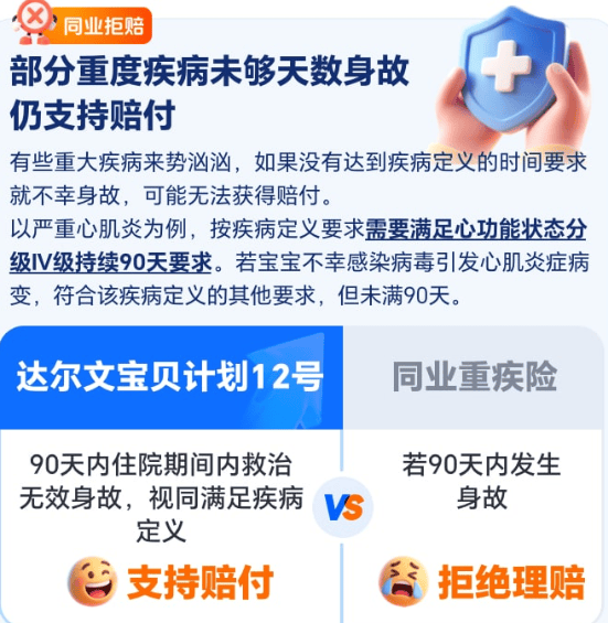 比如达到了严重心肌炎的程度,且导致了身故,但并未满足持续90天时间,依旧可以获得理赔。