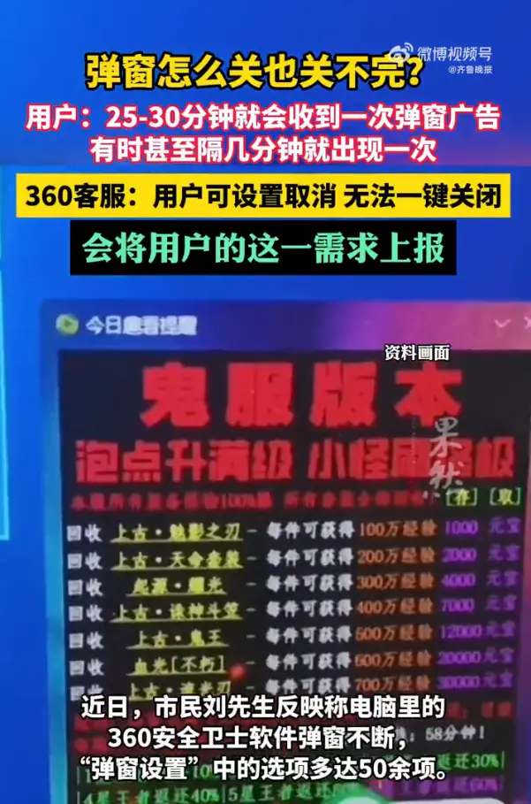 近日有网友反馈,自己电脑里的 360 安全卫士软件弹窗不断。