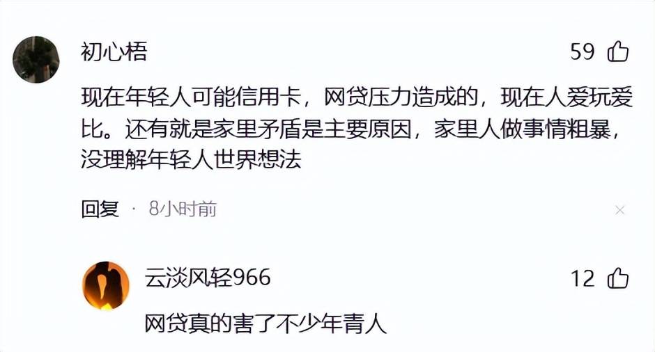 现在年轻人可能信用卡,网贷压力造成的,现在人爱玩爱比。还有就是家里矛盾是主要原因,家里人做事情粗暴,没理解年轻人世界想法
