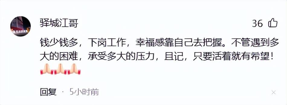 钱少钱多,下岗工作,幸福感靠自己去把握。不管遇到多大的困难,承受多大的压力,且记,只要活着就有希望!