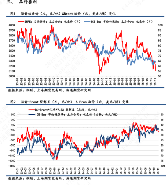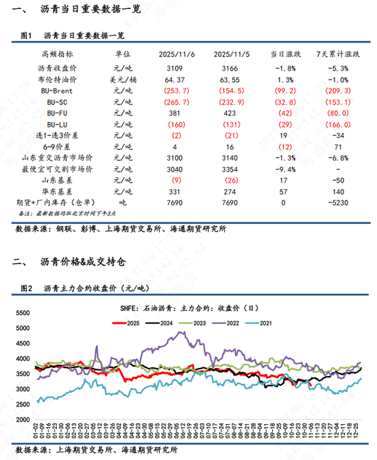 【1】盘面表现:BU主力2601高开后回落,开盘即最高价,全天低位震荡,最终收于3109元/吨,跌幅1.80%,自10月27日高点以来持续回落,7天累计跌幅5.3%,创下年内新低。次月合约2602跌幅 2.04%,合约期限结构呈现近低远高的Contango结构,与1星期前的back结构相反。