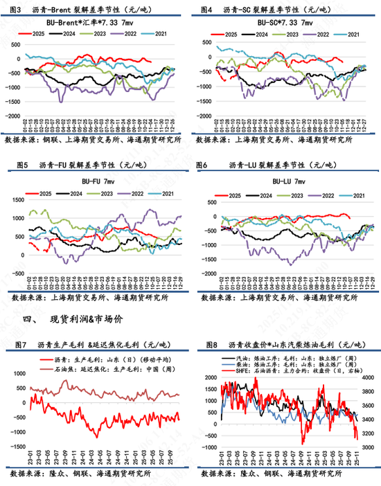 【3】裂解变化:①BU-Brent录得-254元/吨,7天累计跌幅209元/吨,近4美元/桶,裂解差走弱迹象明显。主要由于BU跌得比油价更多。当日BU主力跌幅1.8%;Brent涨幅1.3%(以下午3点收盘成交价计算)。②当日BU-SC/BU-LU/BU-FU回跌,BU-FU跌幅最多。