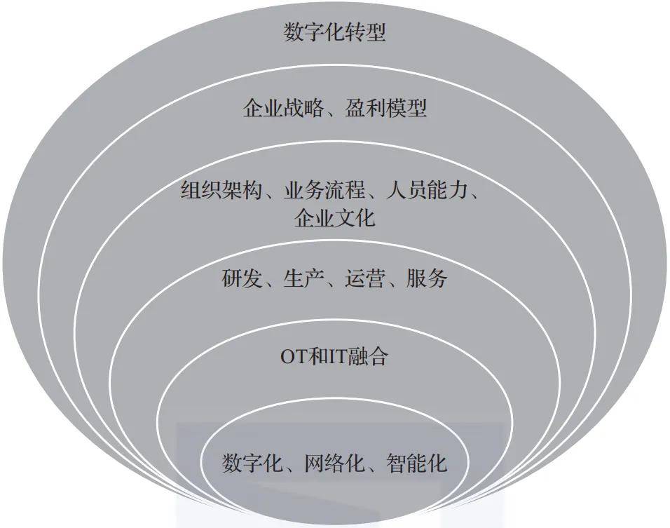 **数字化转型应以客户需求为指引,以组织变革、流程优化、人员能力为保障,由企业文化和环境机遇来促成。**它是数据驱动、智能助力的研发、生产、运营和服务改善,是OT和IT的融合,是数字化、网络化、智能化等数字化技术的应用。互联网、物联网、大数据、云计算、人工智能、5G通信等,均属于数字化技术。图1-3反映了这种层级关系。