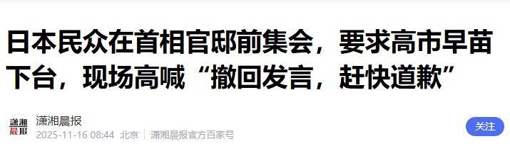 日本前首相鸠山由纪夫批评高市利用危机扩大军力,并警告她可能会把日本推向战争的边缘。11月15日,数百名日本民众在首相官邸前集会要求高市辞职。尽管她在国内右翼支持者中仍然有一定影响力,但当前内外交困的局面已经不容忽视。