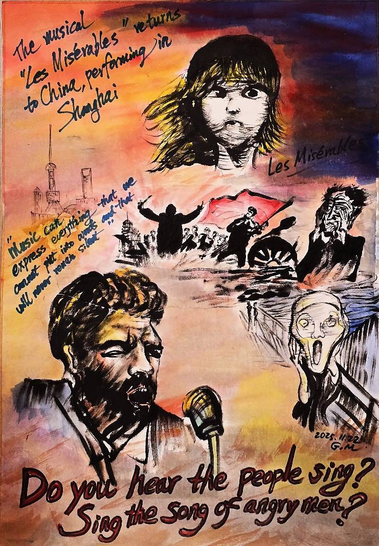 图2 “你是否听到人民的歌声?” 纸本彩墨 65cm X 45cm 李公明作 2025年11月22日