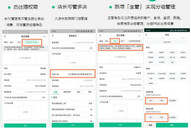 系统构建了**四级角色体系**,涵盖总经理、店长、主管与员工,支持分组管理与数据隔离。过程指标与**业绩看板自动统计**,关键数据一目了然;**高级权限管控、自动预警机制和异常行为预警提示**,筑牢企业数据安全防线。