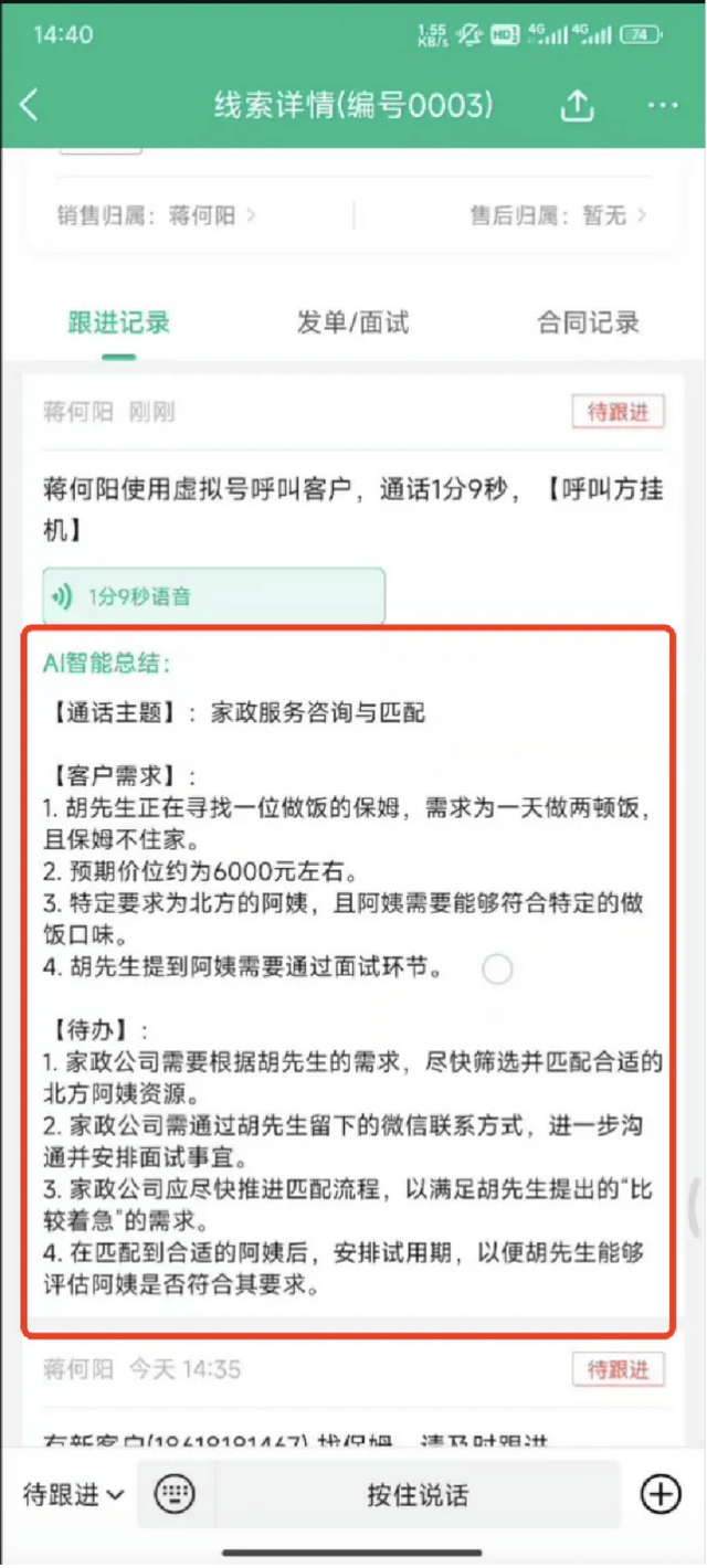 **待办中心**帮助员工有序安排工作,任务自动生成、分类清晰;灵活的**跟进规则与自动提醒**,显著提升跟进时效;结合**虚拟号通话与AI跟进**总结,**自动生成结构化通话摘要**,管理人员可随时调阅复盘、分享,改进话术,大幅提升团队协同效率。