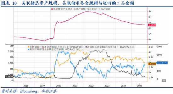 8、银行体系流动性收紧下美联储提前结束缩表。2025年10月底,美联储宣布将于12月1日提前结束量化紧缩。自2022年6月启动缩表以来,美联储资产负债表规模已缩减逾2.4万亿美元。这一过程显著抽离系统流动性,隔夜逆回购余额降至近零水平,银行准备金下滑至2.8万亿美元。同时,财政部重建现金账户而发行的大量短期债券,加剧准备金消耗。货币市场融资成本上升明显,表明银行体系准备金不再充裕,成为美联储提前结束缩表的核心压力指标。