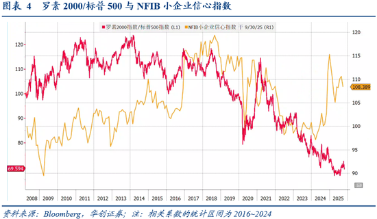 3、美国小盘股与美国小企业信心指数持续分化。美国小盘股的相对表现通常与小企业信心的提升密切相关,即罗素2000指数与标普500指数之比与NFIB小企业信心指数的走势基本一致。我们统计了两者从2016年至2024年9月底的相关系数,可以发现罗素2000指数/标普500指数与NFIB小企业信心指数的相关系数达到了0.77。值得注意的是,2024年10月以来,两个指数出现分化,NFIB小企业信心指数转而抬升,罗素2000指数却持续跑输标普500。