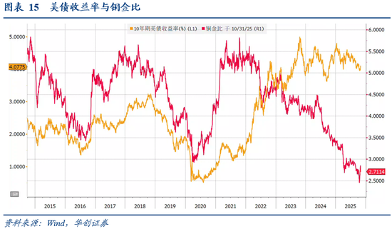 铜金比通常被认为是美债收益率的领先指标,其背后的原理是:铜具有工业属性,被广泛应用于电子电气、家电、机械、建筑等领域,铜的需求通常反映了实体经济的活跃程度;而黄金具有价值储藏功能和避险价值。铜金比可以作为市场对风险资产的偏好和对美国国债安全的感知程度的指标。