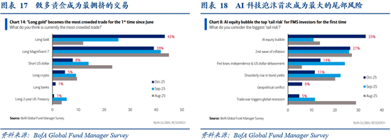 根据美银全球基金经理调查报告,AI科技泡沫首次成为最大的尾部风险。2025年9月,26%的基金经理认为第二轮通胀是最大的尾部风险,其次是美联储失去独立性&美元贬值(24%),第3位是债券收益率的无序上行(22%)。2025年10月,33%的基金经理认为AI科技泡沫是最大的尾部风险,其次是第二轮通胀(27%),第3位是美联储丧失独立性&美元贬值(14%)。