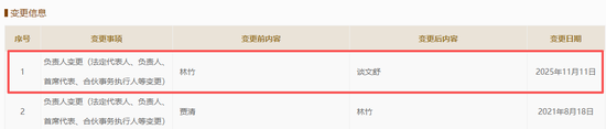 红星资本局查询国家企业信用信息公示系统发现,11月11日,公司负责人信息(法定代表人、负责人、首席代表、合伙事务执行人等)已由“林竹”变更为“谈文舒”。