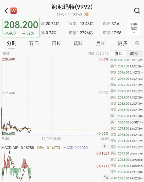 受消息影响,泡泡玛特港股早盘直线下挫,一度跌超5%。截至发稿,该股报208.2港元/股,总市值为2796亿港元。
