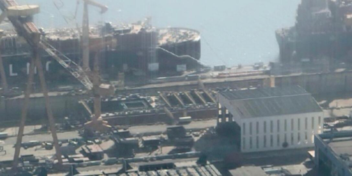 干船坞内建造中的船体局部放大,明显可见内部有“方盒子”状结构