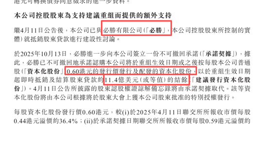 在推进债务重组过程中,控股股东发挥了关键作用。10月13日,控股股东所控制的实体必胜有限公司签署不可撤回承诺,以每股0.60港元的价格,将11.4亿美元股东贷款的结余部分全额转股。