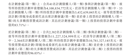 此次参与投票的债权人规模庞大,第一类计划债权人会议有41名债权人参与,投票债权总额达41亿美元;第二类计划债权人会议更是吸引了2382名债权人参与,债权总额约112.3亿美元。