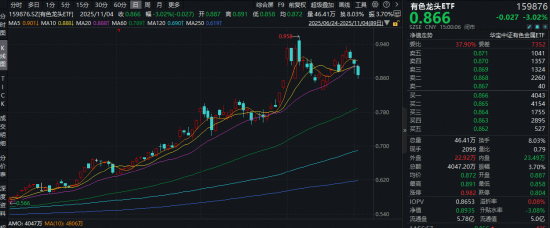 市场盘整回调,有色金属板块领跌两市,揽尽有色金属行业龙头的有色龙头ETF(159876)深陷水面以下,场内价格收跌3.02%,日线3连阴,暂失10日、20日短期均线,但中长期均线(60日均线、半年线、年线)仍呈多头排列,中期上升趋势的技术基础仍在,下方支撑较强。