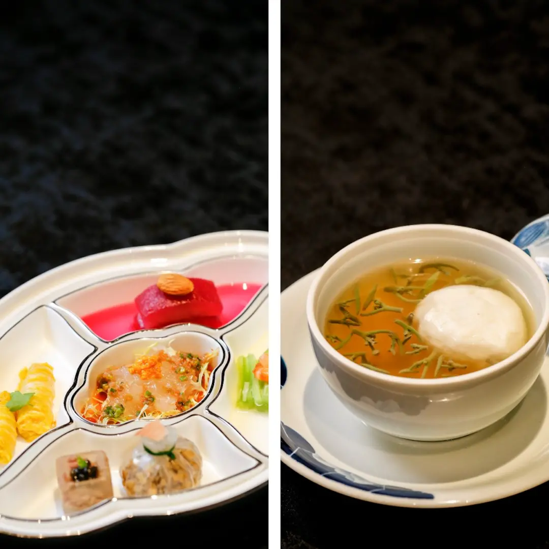 先是一道**江南锦绣冷菜拼**,应的是“我爱山居好,蔬畦间莳花”的野趣,以江南冷菜八味围碟为灵感,鹅黄、翠绿、绛紫、淡红错落有致,用至繁至复的色彩取悦视觉,同时用至简至纯的味道打开味蕾;再一道**沉鱼落雁纯芽汤**,应的是“水流清影通茶灶,风递幽香入酒筵”的自在,以江南春季的时令茶菜为灵感,一碗龙井鱼丸汤,鱼丸中间还包裹着紫菜,海物的鲜美与茶之甘醇相得益彰,正是淮扬菜新鲜淡雅的最佳体现。