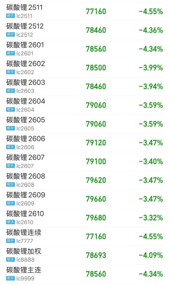 11月4日,:碳酸锂期货价格大幅回落,主力2601合约收盘下跌4.34%,报78560元/吨。