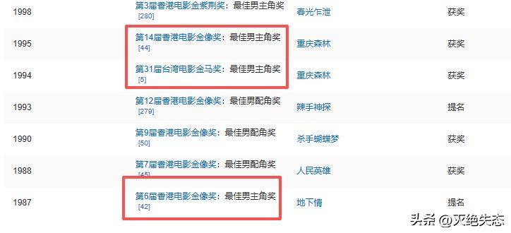 1995年,他凭借《重庆森林》,更是拿到金马奖、金像奖最佳男主角奖。